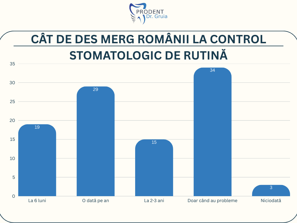 În ceea ce privește controalele stomatologice, 19,23% dintre participanți merg la un control de rutină la fiecare șase luni, iar 28,85% o fac anual. Totuși, 33,76% merg doar atunci când au o problemă dentară, iar 3,31% nu au fost niciodată la stomatolog.