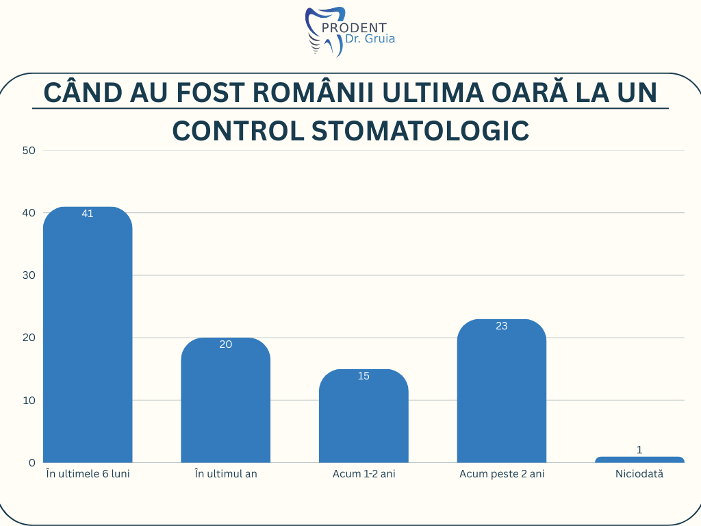 Ultima vizită la medicul stomatolog a avut loc în ultimele șase luni pentru 41,45% dintre respondenți, în ultimul an pentru 20,09%, în urmă cu 1–2 ani pentru 14,74% și cu mai mult de doi ani în urmă, pentru 22,65%.