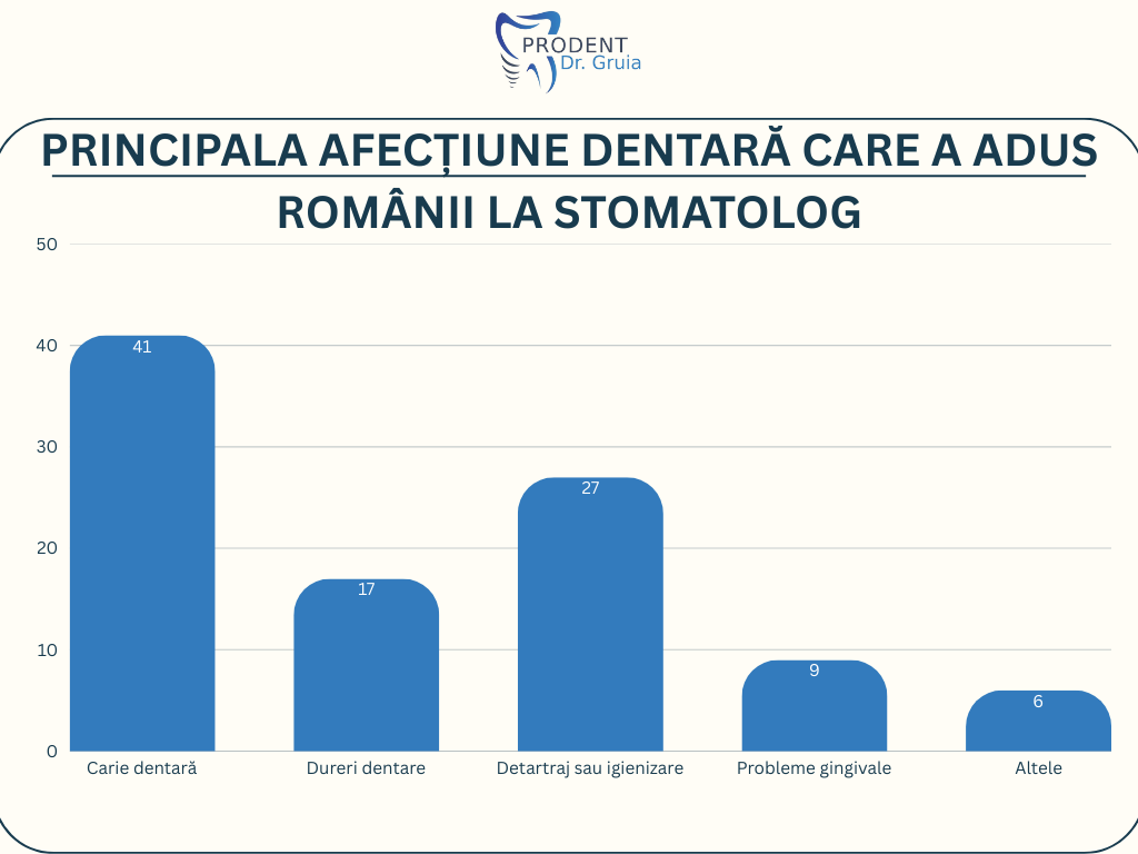 Cele mai frecvente motive pentru prezentarea la stomatolog sunt cariile dentare (41,45%), urmate de detartraj și igienizare (26,92%) și durerile dentare (16,67%).