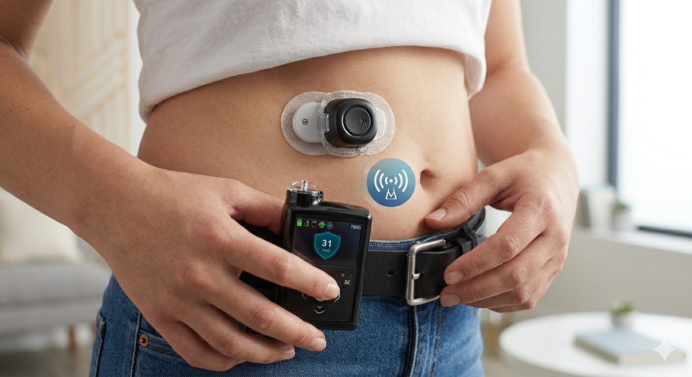 • Termeni Medicali: Senzorul este un dispozitiv de purtare (wearable) cu un transmițător reîncărcabil care se aplică pe piele. Este crucial pentru funcționarea sistemului pancreas artificial, deoarece pompa utilizează datele senzorului pentru a opri sau a mări livrarea de insulină, menținând glicemia într-un interval țintă (TIR – Time In Range).